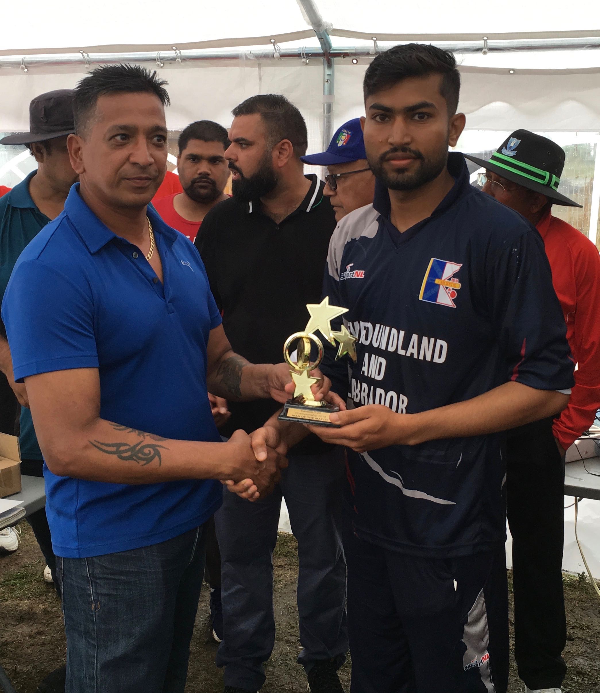 The final day of the Eastern T20 started with a good win for the provincial team over New Brunswick. After losing an early wicket a 2nd wicket partnership of 46 between Rahul Vashistha (18) and Mesam Timmar (32) set the foundations for a good total. The pitch was not easy, the grass long and the boundaries longer, so they played a controlled game, with excellent placement of shots and running between the wickets. Abhishek Doshi (22) played well in the middle order and the bats worked hard for every run of the 114 final score.